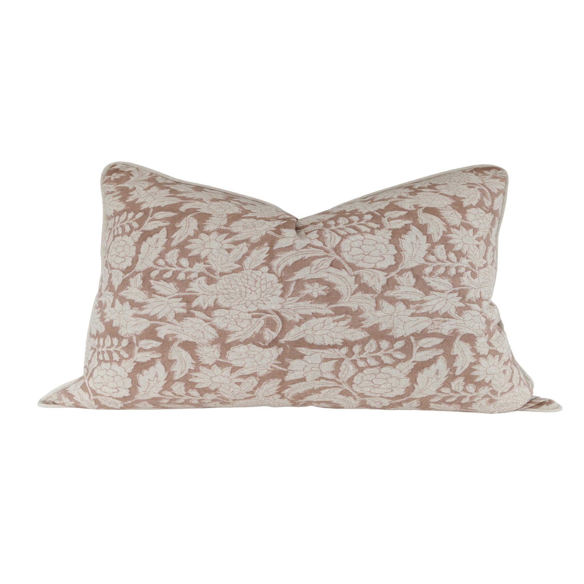 This timeless pillow features an intricate floral block-print in muted pink tones layered over a warm, natural linen background. The hand-printed botanical pattern brings a touch of vintage charm, while the subtle color palette keeps it sophisticated and elegant. Perfect for adding a gentle, feminine layer to neutral bedding, cozy living rooms, and cottage-inspired spaces. A classic, airy floral that feels effortlessly elevated and refined.