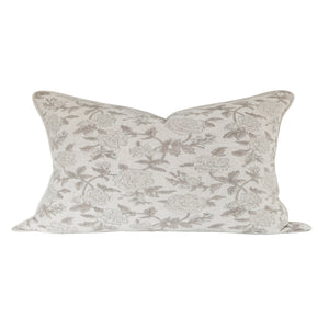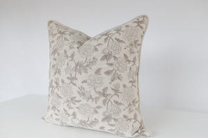 Soft, romantic, and timeless; this pillow features a delicate floral print in muted taupe shades layered over a warm, natural linen background. The hand-drawn botanical pattern brings a touch of vintage charm, while the subtle color palette keeps it sophisticated and elegant. Perfect for adding a gentle, feminine layer to neutral bedding, cozy living rooms, and cottage-inspired spaces. A classic, airy floral that feels effortlessly elevated and refined.
