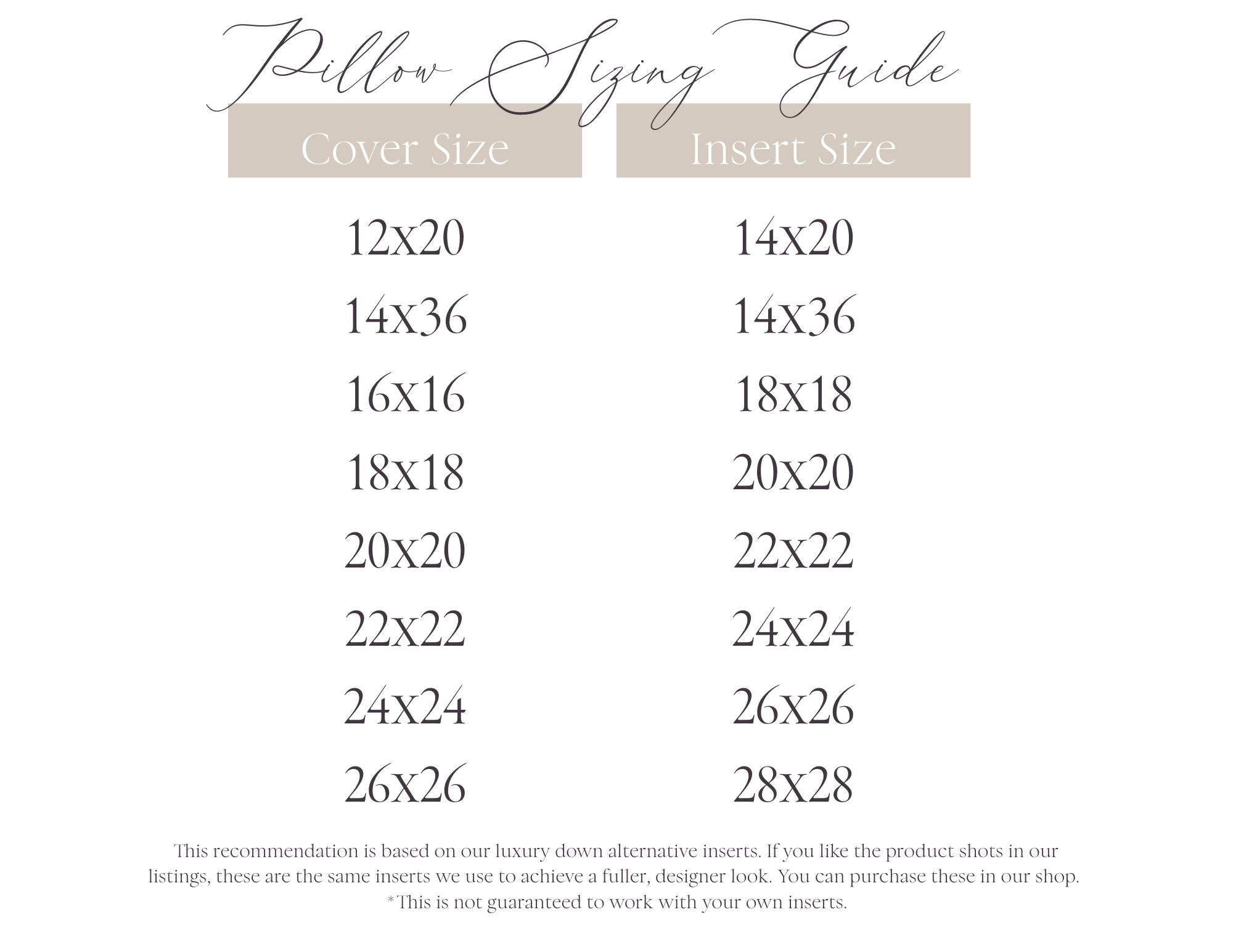 So that your cover is filled out completely, we encourage purchasing an insert 2 inches LARGER than the size of the pillow cover. i.e. Purchase a 20x20 insert for an 18x18 pillow cover.