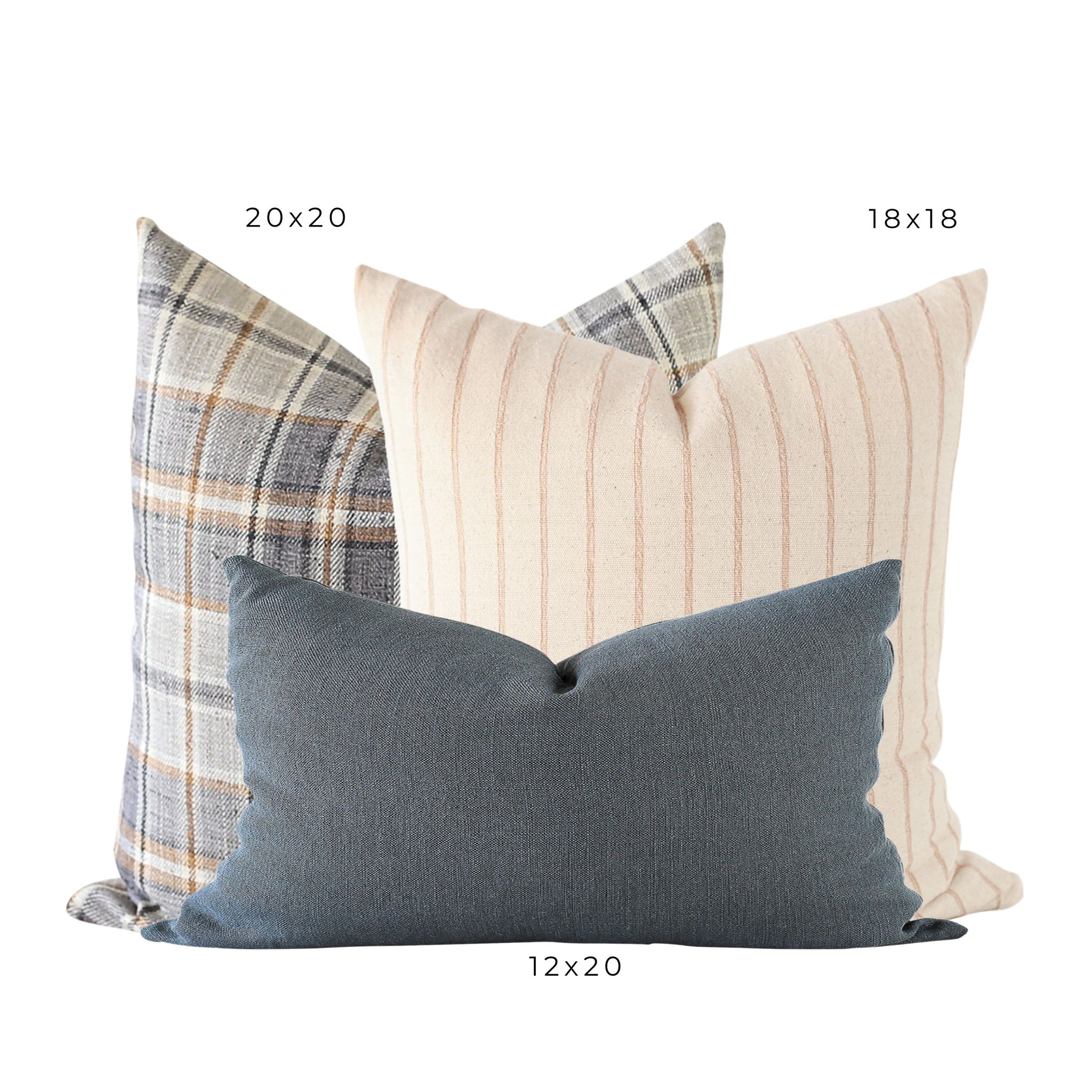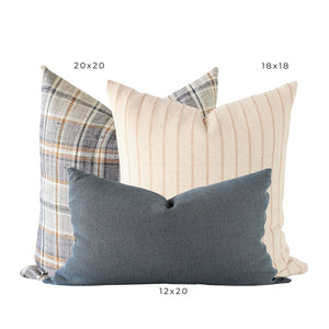 Create a cozy look for your living space with this 3-piece pillow set. Featuring a plaid cover with warm fall colors, a soft cream pillow with textured stripes, and a solid modern blue lumbar pillow, this set blends timeless design with a contemporary feel. The mix of stripes, warm tones, and textures makes it perfect for enhancing your fall decor or adding a soft, earthy aesthetic to your home all year round. Ideal for sofas, beds, or accent chairs, these versatile pillows are perfect for layering and adding depth to any room.